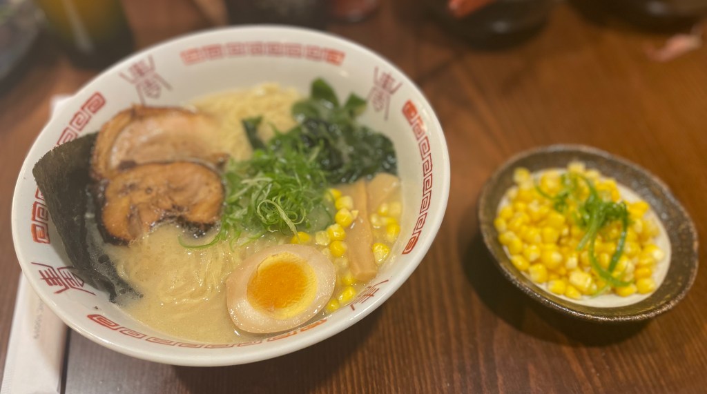 My sister and I both ordered the Tonkotsu Ramen. With the Tonkotsu Ramen you can either get pork belly chasu or chicken with bamboo shoot, egg, scallion, corn and seaweed in a pork bone broth. We both ordered the pork belly chasu and an additional side of corn to add into the ramen.