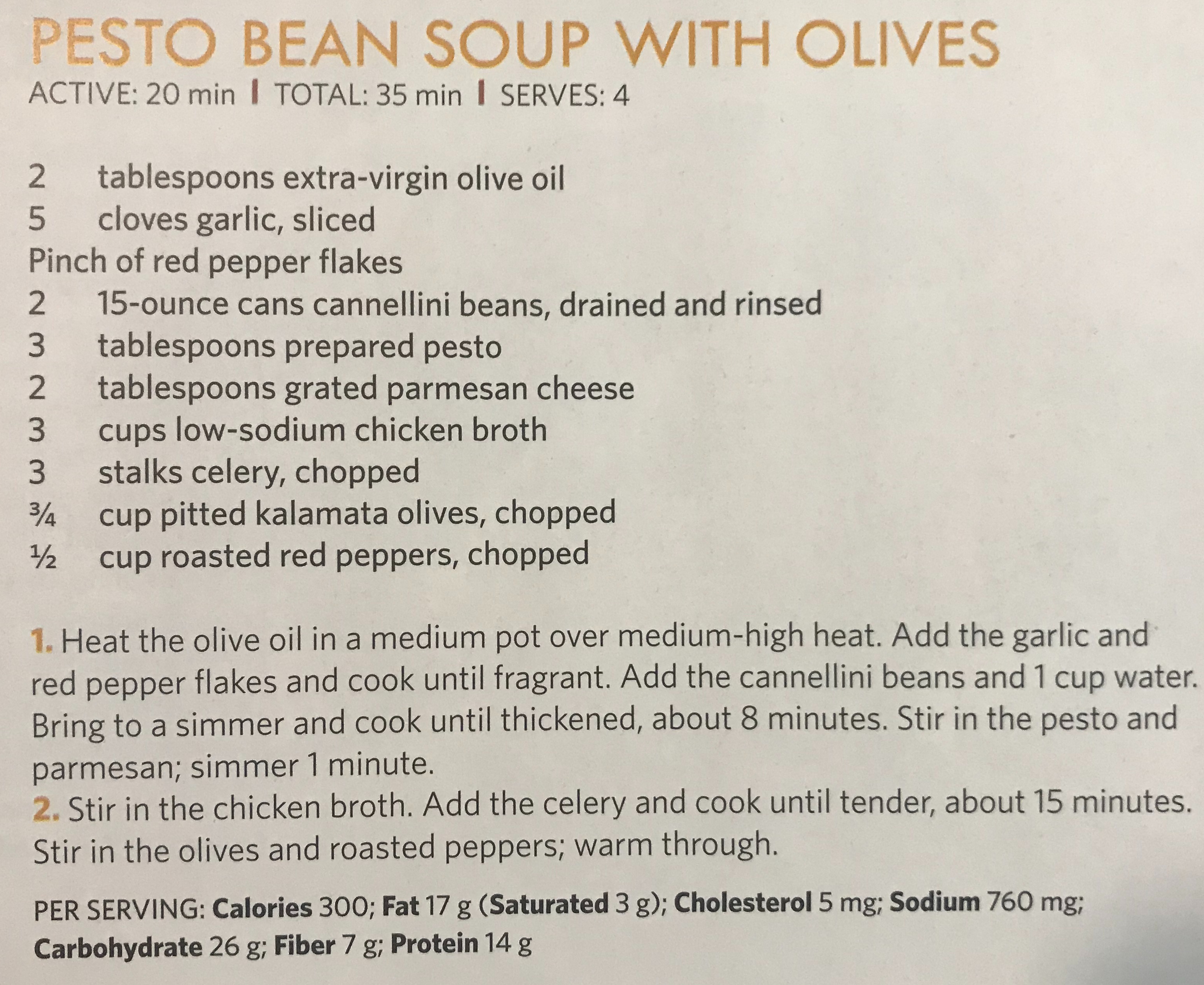 A few weeks ago I made this Pesto Bean Soup with Olives that I found in Food Network Magazine: Super Easy Soups & Stews (this was a great Christmas gift!). I personally love soups. I think they’re always very easy to make, and they typically turn out great (I had one recipe that didn’t really go as planned…). Plus, there are so many options with soup! And it’s a great comfort food. I must say, I’ve tried very hard to plan out my recipes so that I’m not cooking soup every single week, and it’s hard! They just always look so good!! Also, this recipe only has two steps, so how could I not?