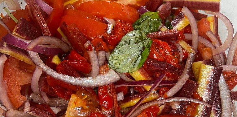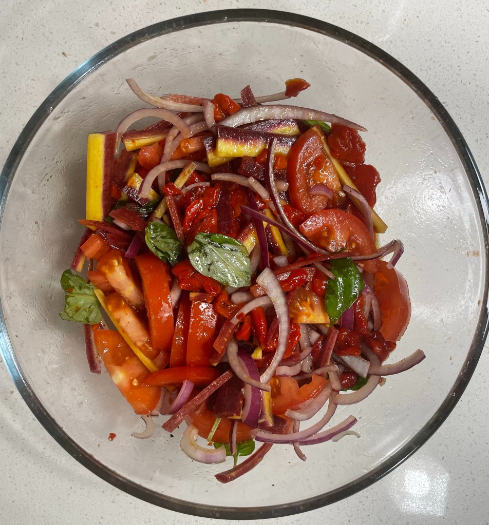 Prep onion, tomatoes, roasted red bell peppers, and purple carrots
