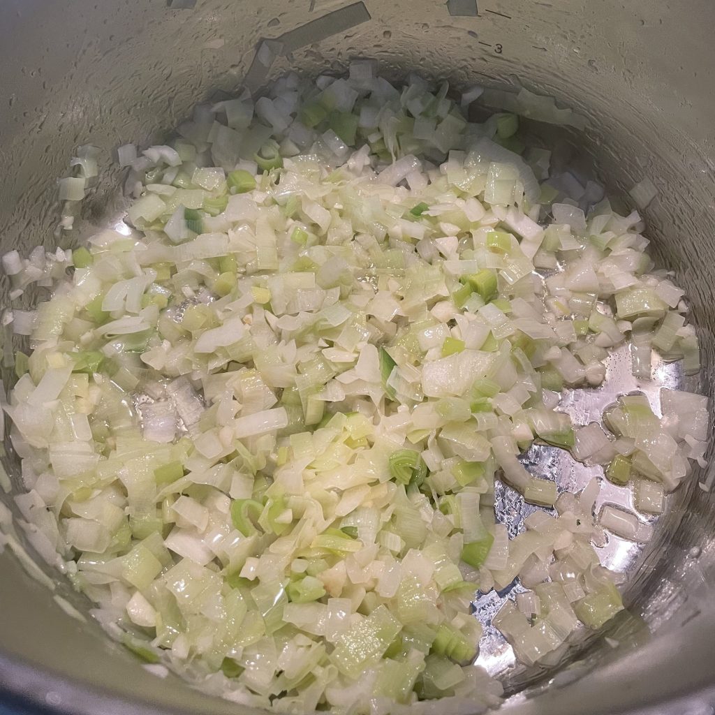 Mix of the leek, yellow onion, and garlic cooking. Leeks are halved, sliced, and rinsed before use.