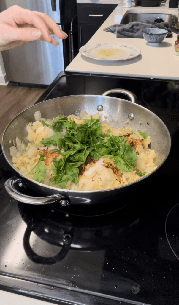 Although there is spinach mixed into the dish at the end, I would have liked some additional veggies. To me, this dish was on the heavier side with the chicken broth rice and the chicken. I felt that it needed something to balance that heaviness.