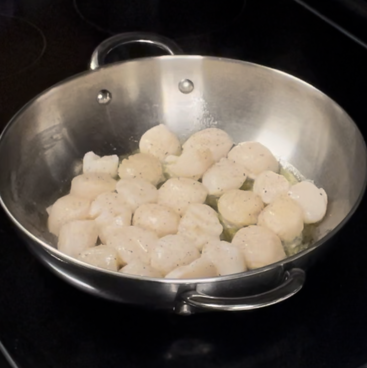 Heat olive oil in skillet over medium-high heat until hot. Add scallops in single layer. In a separate pot, prepare water for boiling to make linguini (cooks for 8-9 minutes)*