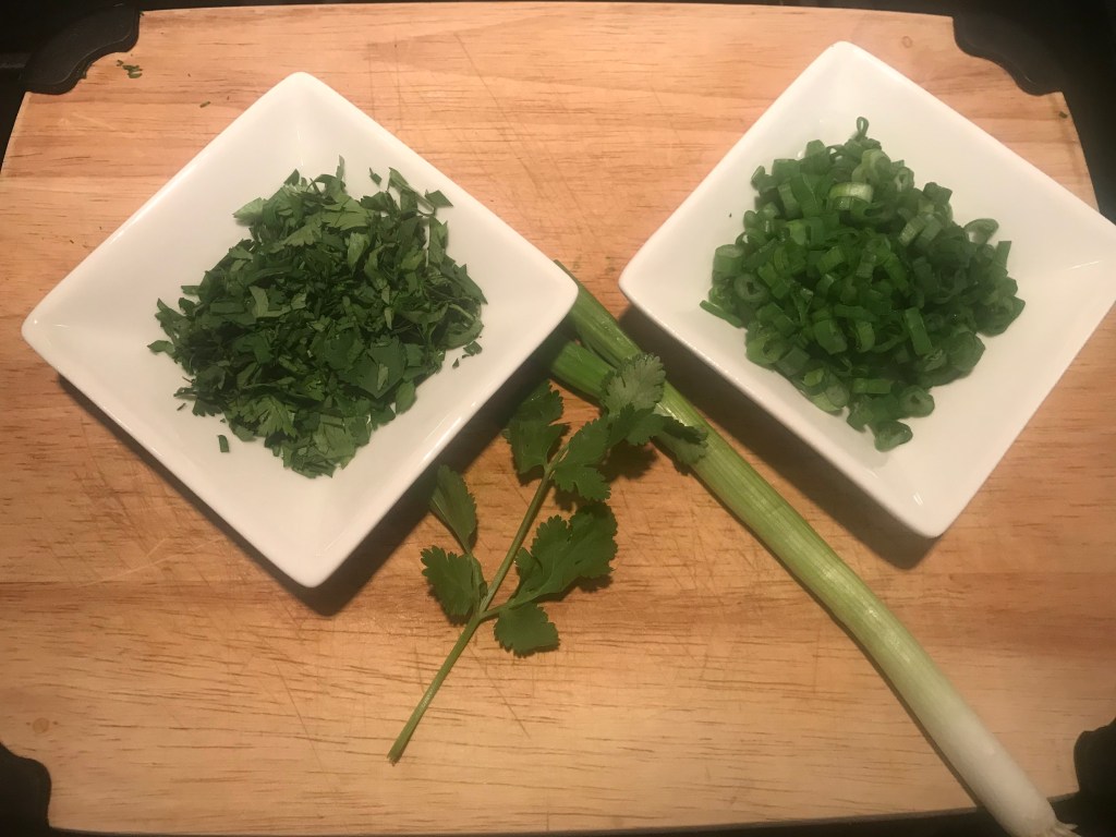 This recipe is incredibly easy. With the canned beans, pop them open, rinse, and drain. I know some people have a preference for drying canned items such as beans, peas, corn, etc. after they’ve rinsed it, so do whatever you’re more comfortable with. I halved my tomatoes short-ways and diced my onion. The diced onion was nice because I didn’t notice how much onion was in the dish, but I think next time, my preference will be to have the onion in thin slices, just to add some variety to the sizes of items. I minced the parsley and cilantro, and threw everything into a big bowl.