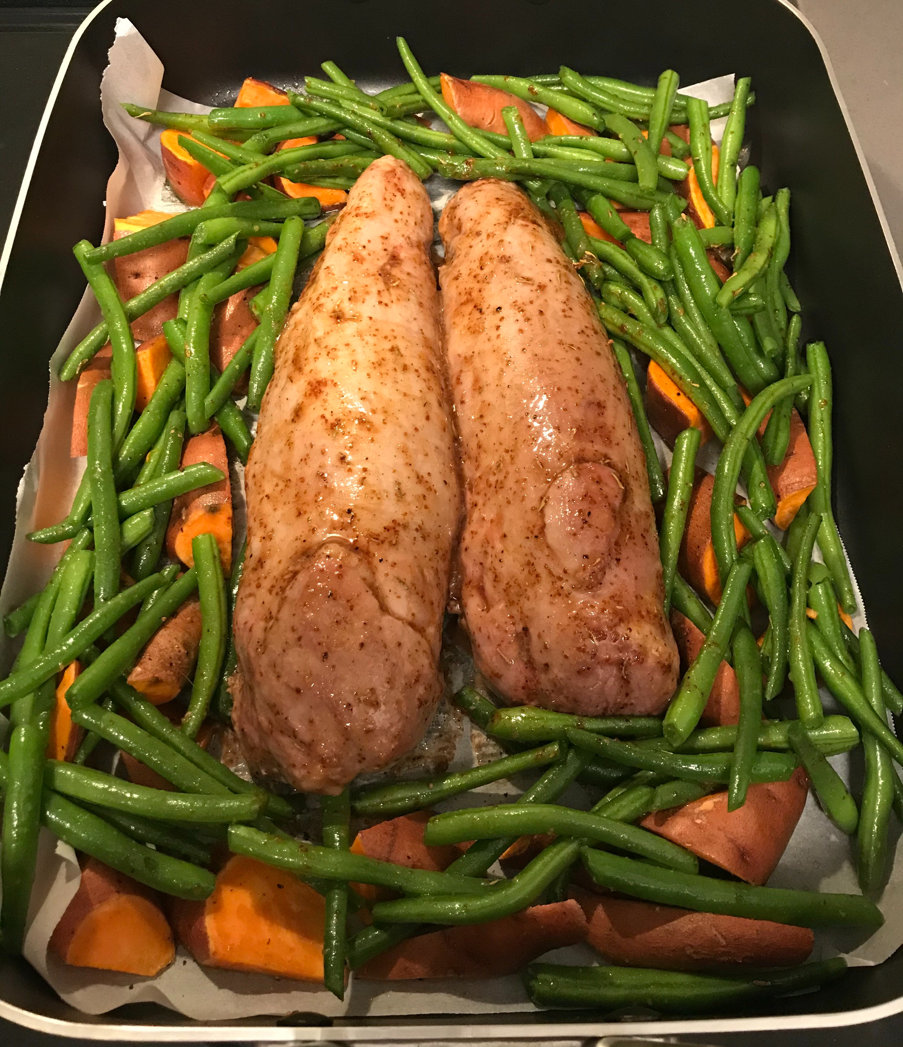 The recipe called for a 20-oz pork tenderloin, and naturally, I don’t know what that means. I think when I went to buy it, it only displayed the amount in pounds, and that’s not a conversion I know how to do in my head an apparently I was too lazy to pull out my phone, so I bought about 2.5 lbs of pork tenderloin. There were only about 3 options and they were all about the same size anyway. But in doing so, I think I should have bought more sweet potatoes and beans because I felt a little low on veggies after cooking.