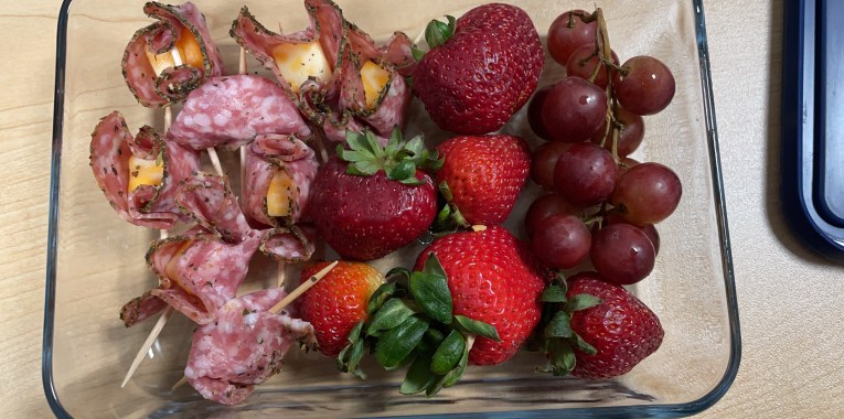 I’m a big fan of the cheese and fruit combo. This is a snack box from when I was in Kansas City where I sometimes worked late due to the nature of my project. This is also a very easy box to make and requires little preparation. I wash the grapes and the strawberries and combine the salami with the cheese cubes. I don’t cut the strawberry tops; instead I just bite until the calyx and put them back in the box. Then I throw them out when I get home. The grapes are still on the stem, and after I’ve plucked the grapes, I put the stem back in the box and bring that home as well to throw it out. This minimizes how much time I’m spending prepping these boxes. They seem like small actions initially, but there’s also any clean up (knife, cutting board, etc.), so I can avoid that and spend time on other things.